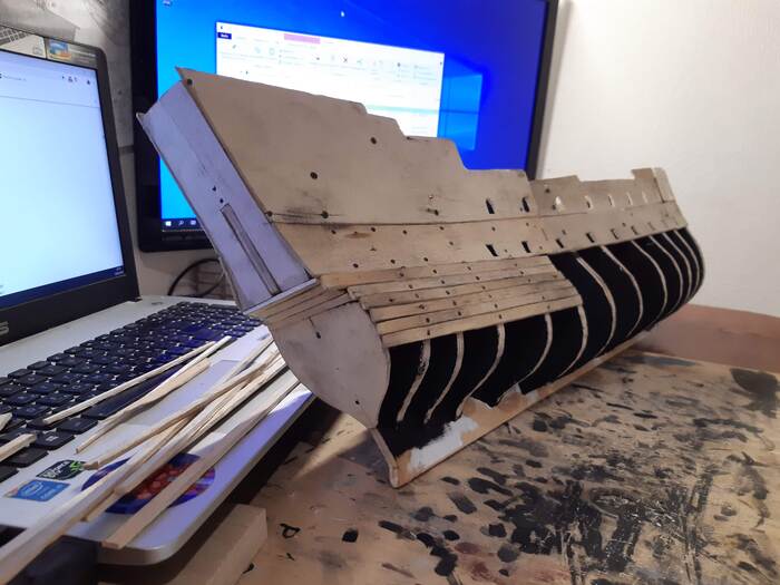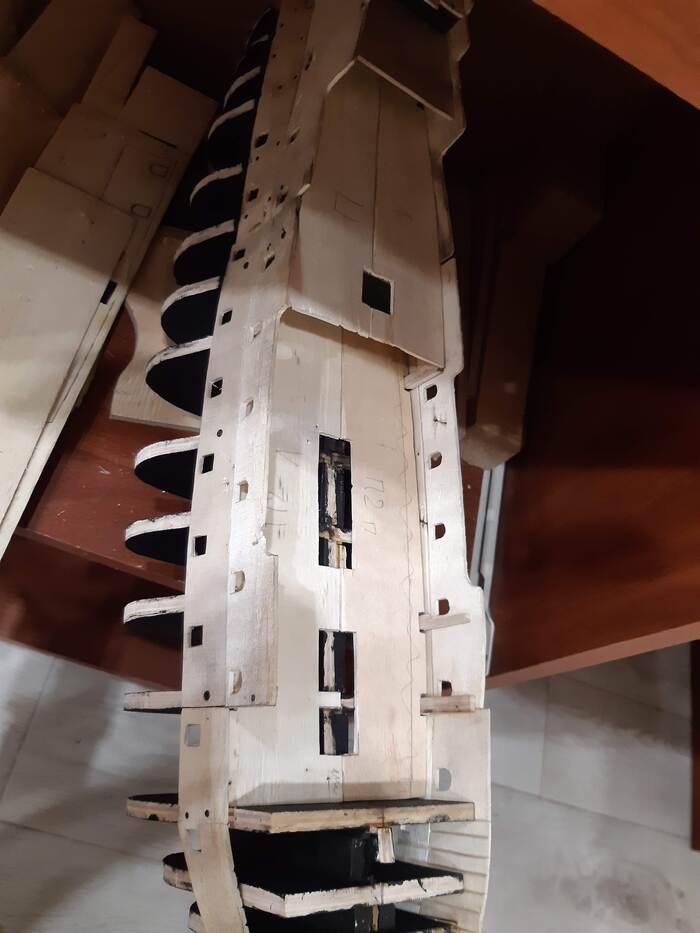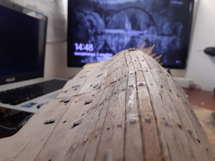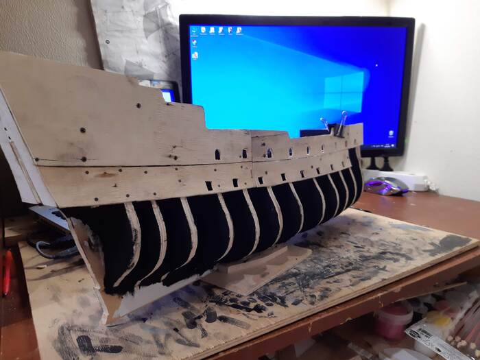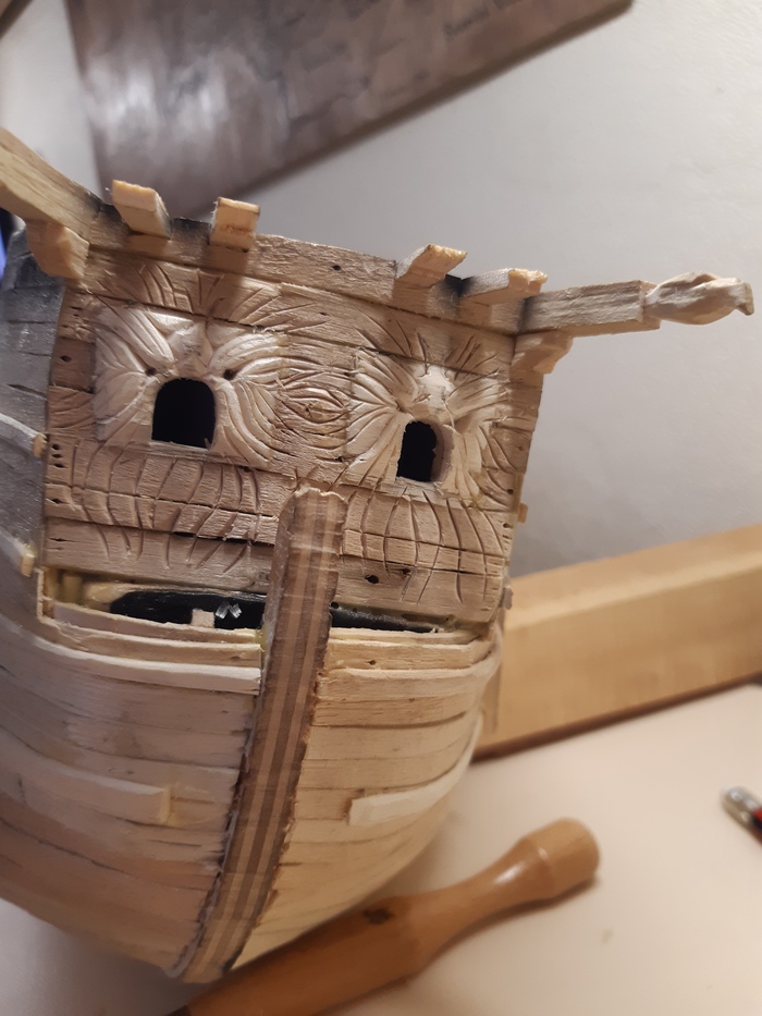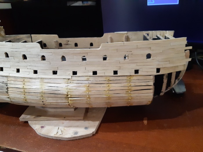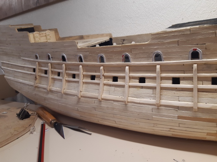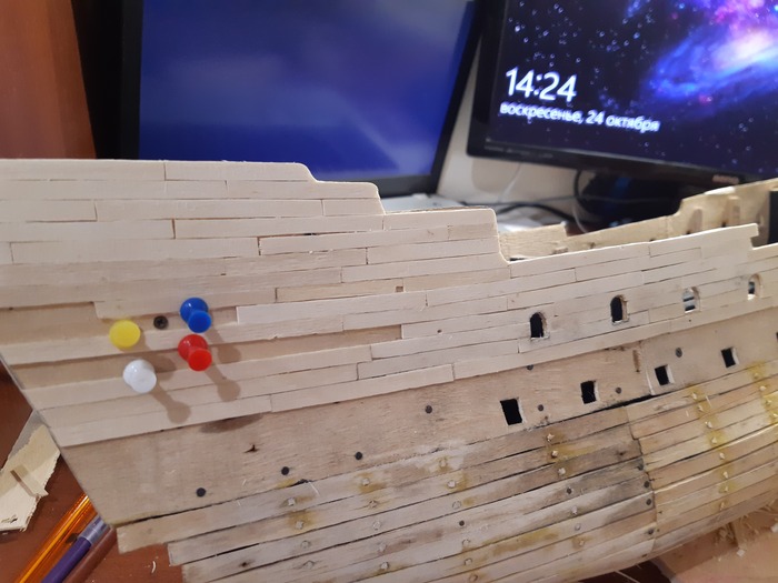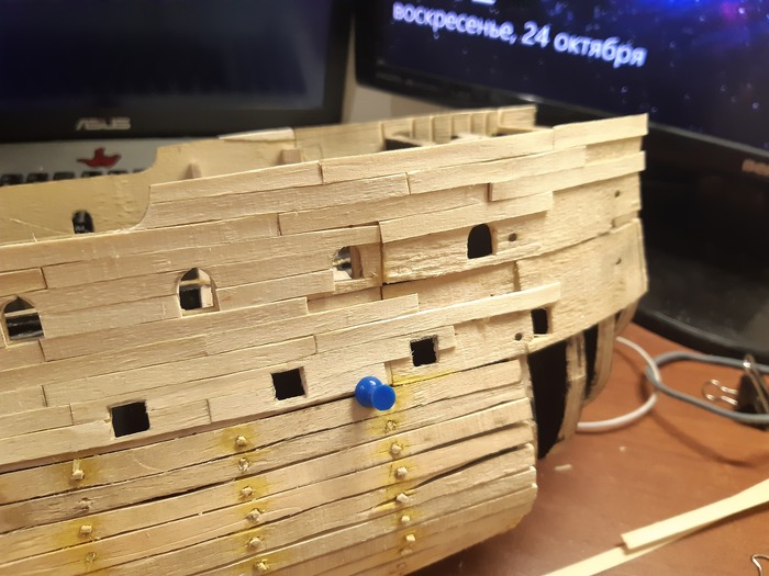 Пришло время пушечных портов, долго не мог решить лепить их из чего-то или делать из дерева. Остановился на втором варианте.