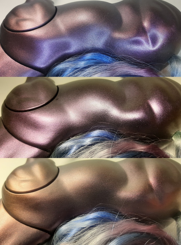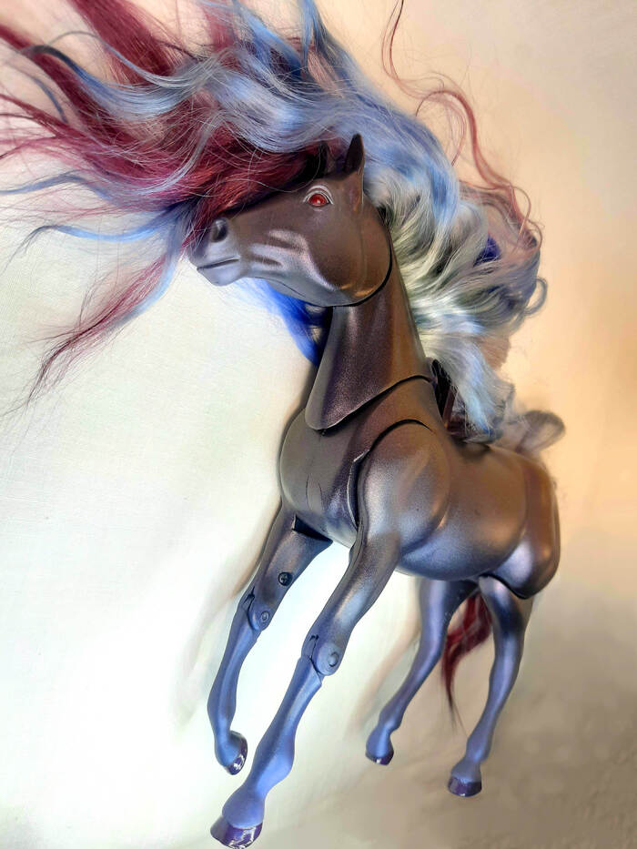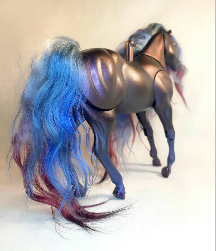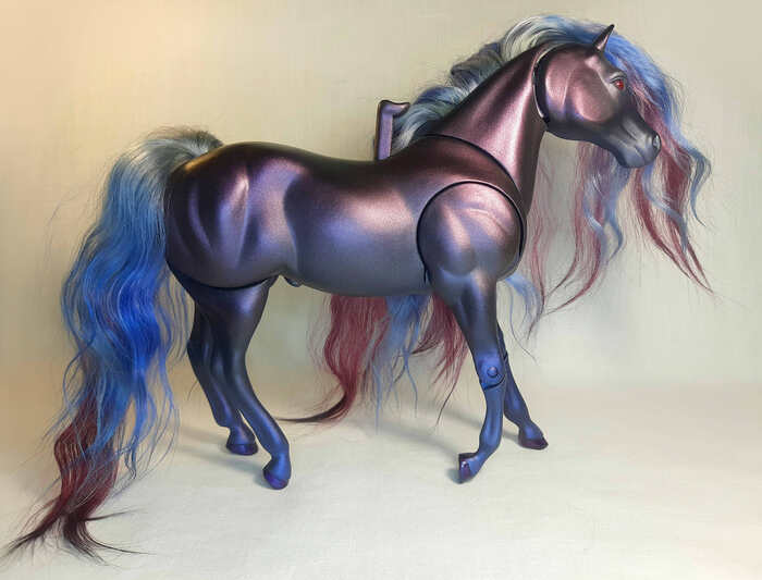 При нажатии на кнопку у холки "прыгает". Конь перекрашен, грива с хвостом прошиты натуральной козьей шерстью. Цвет корпуса меняется от угла освещения.