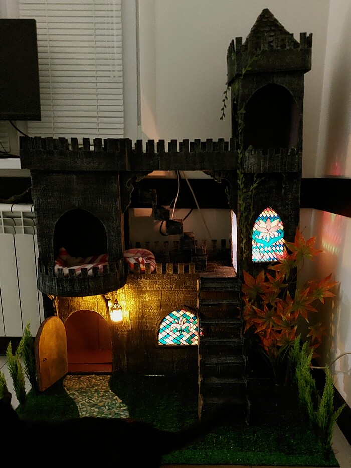 Сам замок покрасила чёрным акрилом, затем серым, в технике сухой кисти. Сшила матрасики для всех комнат, повесила над входом декоративный фонарик.