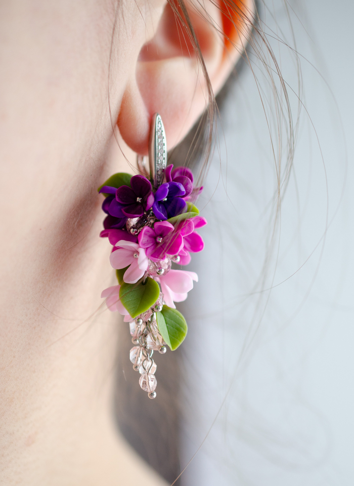 Каждый цветочек вручную слеплен из запекаемой глины, собрано все на гипоаллергенную фурнитуру