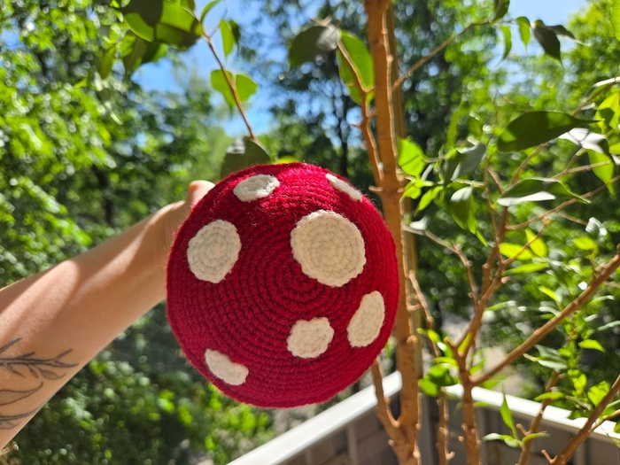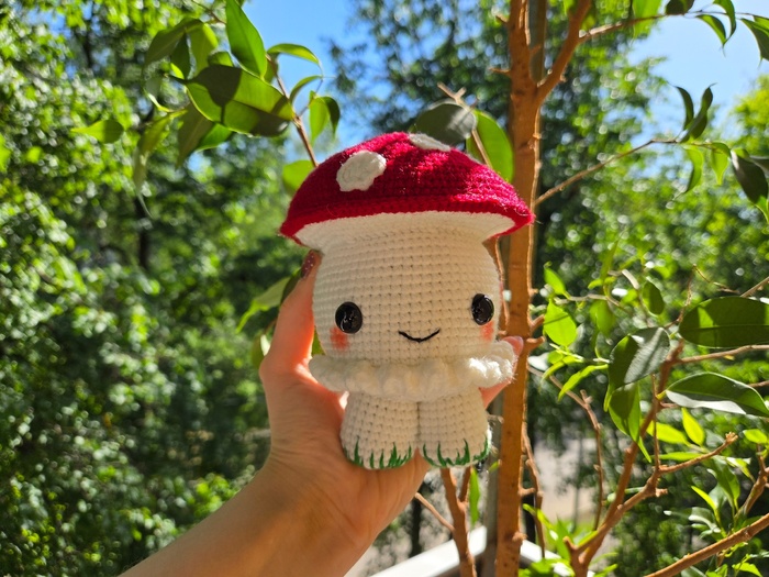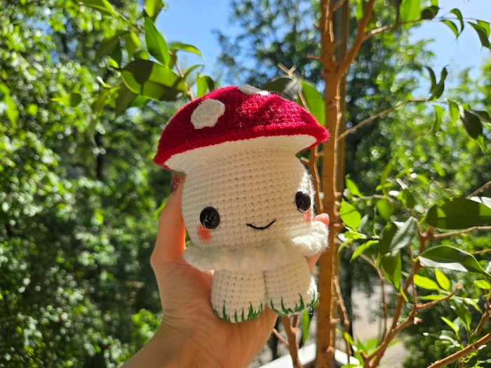 Недавно у нас с Tori заказали психоделического грибочка (он был в наличии, и Tori спокойно его отдала). В тот же день девушка написала с просьбой связать ещё одного, но уже в расцветке мухомора. Поскольку у Tori сейчас много дел и она не берёт заказы, работу взяла на себя я.