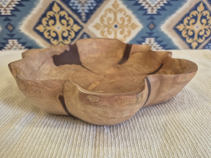 Фруктовница из спила можжевельника. Трещины залиты эпоксидной смолой, финишное покрытие минеральное пищевое масло.