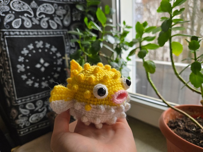 В этот пасмурный день хочу поделиться с вами моей первой связанной рыбкой фугу.
