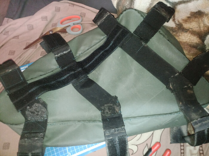 На фото видно, что напротив папки на другой стороне поверх идёт велкро-липучка, она там специально, т.к. какие-либо кармашки или отделения на стенках я не делал изначально, решил что лучше сделать их съёмными, и делать их по необходимости, которые будут крепиться на липучку и и стропами.