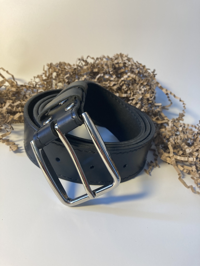 Отрешали заготовку установленной ширины с помощью ремнереза. Сняли толщину в месте крепления пряжки на 1/3. Сделали все отверстия. Прошили вокруг. Обработали урезы. Вставили пряжку. Закрутили винтами. Готово.