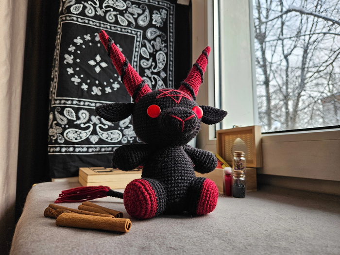 Однажды в мастерскую мне написала девушка с просьбой связать Бафомета с прямыми рогами бордового цвета. Она написала огромный текст, где описывала то, что у моих бафометов рога не прямые, а ей очень нужны именно прямые, как у козла.