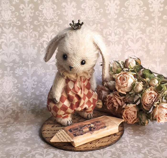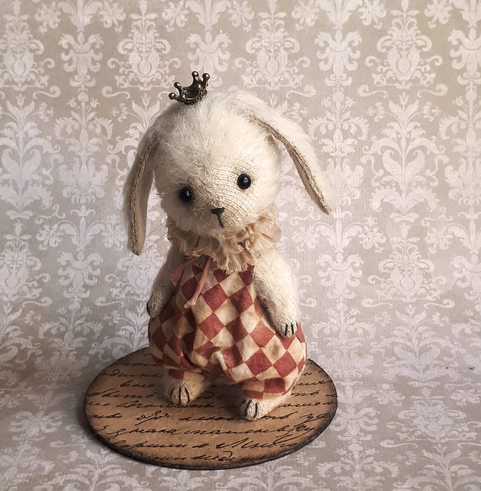 Зайчик сшит из белого мохера. Состарен. Набивка - опилки. Стеклянные черные глазки. Имеет 5 шплинтовых креплений. Голова и лапки вращаются. Может сидеть и стоять. Рост стоя - 10,5 см.