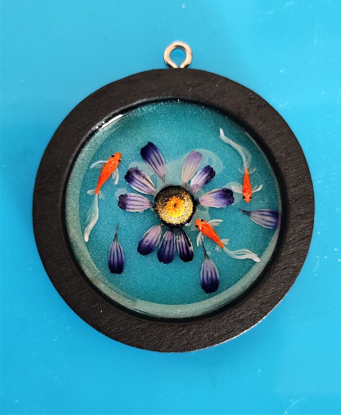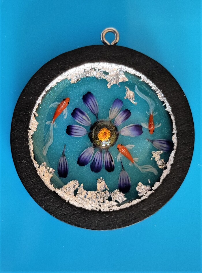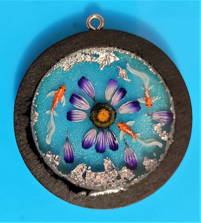 Кулон "Круглый стол" с нарисованными рыбками. Рыбки послойно нарисованы акриловыми красками для придания эффекта объёмной картинки.