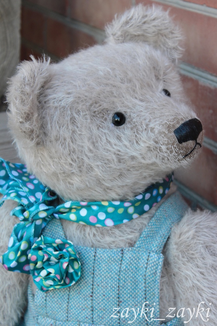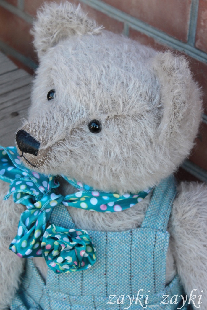 Этот мишка ростом 62 см, сшит из мохера производства Германии Schulte. На выполнение уходит примерно 5 дней. Все детали мишки сшиваются вручную обыкновенной иглой с ниткой. У мишки шплинтовое крепление, голова и лапки вращаются. Глаза стеклянные, носик вышит и покрыт лаком, набит мишка синтепухом, утяжелён стеклогранулятом. Внутри мишки ревун.