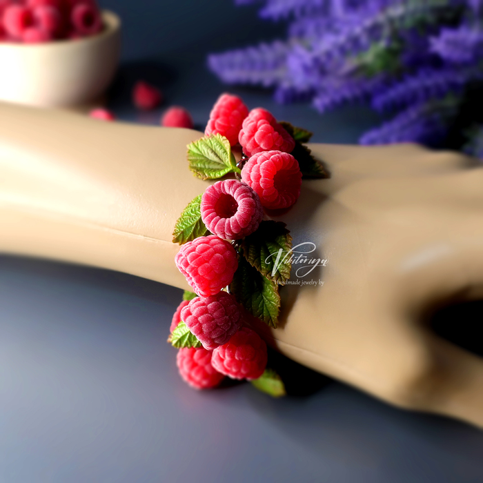 Браслет с бархатными ягодами малины и листьями. Все элементы выполнены вручную из полимерной глины.