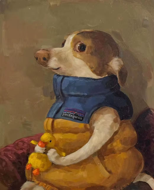 Собачка в тёплой куртке и с игрушкой-уточкой. Ссылка на постер