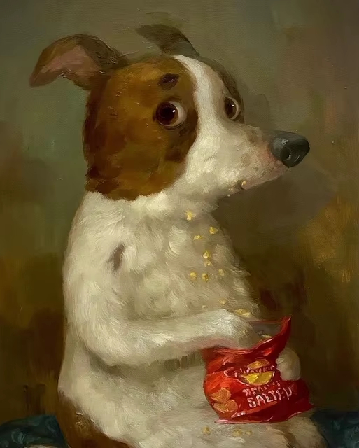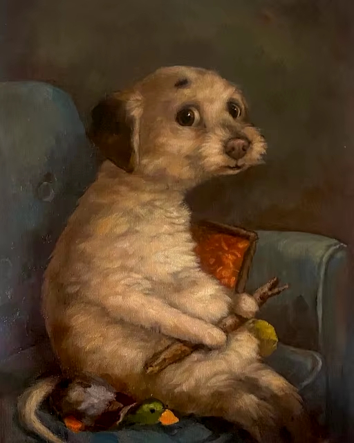 Собачка позирует художнику с книжкой, которую неправильно держит. Ссылка на постер