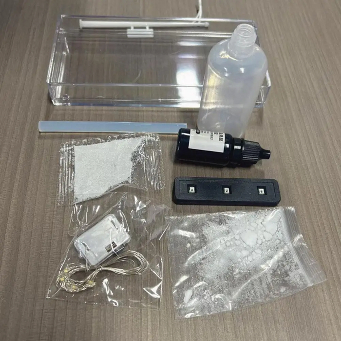 Прикольный набор для самостоятельной сборки, склейки, наполнения жидкостью и снежинками милого ночника с электронным фонарём и со сценой в снежную ночь. Ссылка на набор.