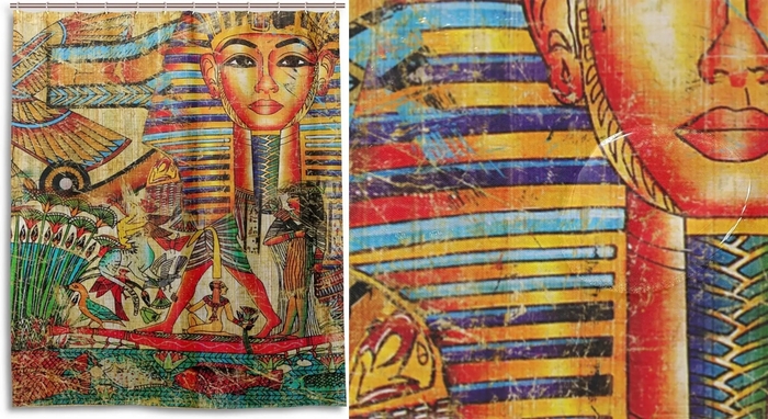 Красивейшая штора для ванной в стиле древнего Египта с эффектом потёртостей и царапин, как будто вы её откуда-то раскопали и повесили. Ссылка на шторку. Доступно 5 размеров на выбор.