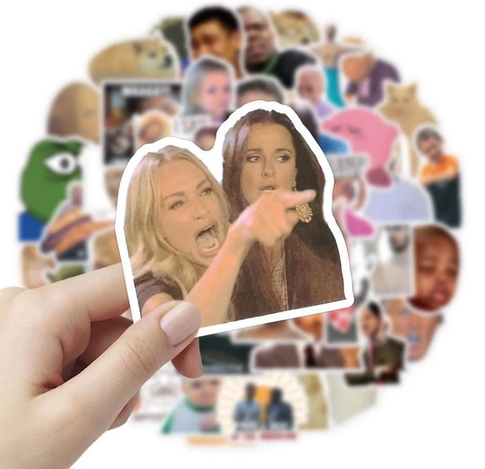 Ещё один набор рандомных популярных мемов-наклеек из интернета. Ссылка на комплект из 50 штук.