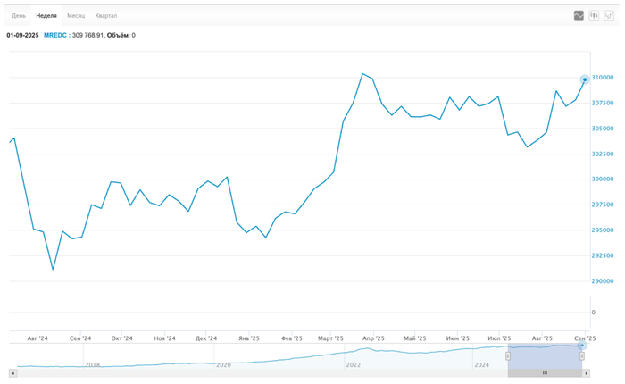 Готовится к снижению ставок. Индекс MREDC 307,7к → 309,4к за метр. Уже недалеко от исторического максимума.