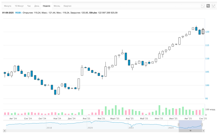 RGBI прекратил коррекцию: 119,06 → 120,95. Скоро снижение ключа. Я продолжаю покупать длинные ОФЗ.