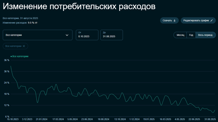 Инфляция за неделю составила -0,08% после 0,02% неделей ранее — дефляция вернулась. С начала года рост цен составил 4,10%. Годовая инфляция снизилась с 8,79% до 8,3%. Снова дешевеют овощи.
