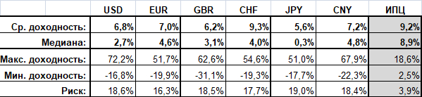 Только швейцарский франк показал среднюю доходность выше средней инфляции. Все остальные валюты отстали. Медиана же у всех валют ниже инфляции как минимум в два раза.