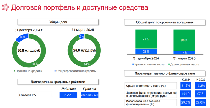 💡 Компания сократила свой кэш на счетах до 3,5₽ млрд (на конец 2024 г. было 5,5₽ млрд, сократили долг). Долг компании сейчас составляет 26,8₽ млрд (на конец 2024 г. было 30,8₽ млрд), как вы понимаете, чистый долг продемонстрировал значительное снижение — 23,3₽ млрд (-8,3% г/г), а показатель Чистый долг/EBITDA составляет 1,61x.