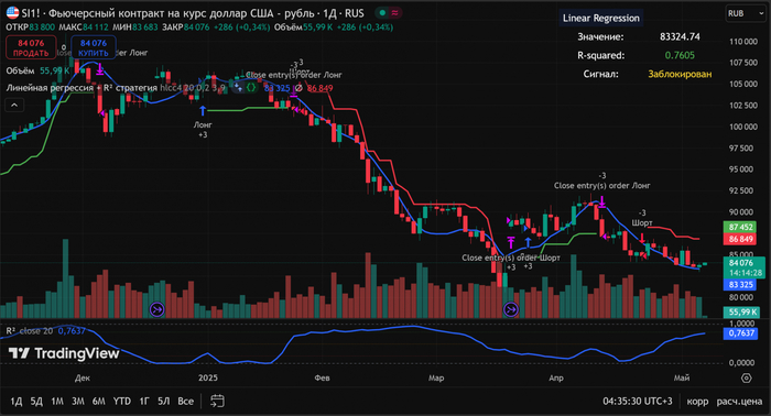 Почему это круче скользящих средних? У регрессии меньше запаздываний и она точнее «схватывает» развороты. А R-squared помогает не гадать - есть тренд или просто случайное движение. Вместе они дают простую, но мощную систему фильтрации шума и подтверждения тренда.