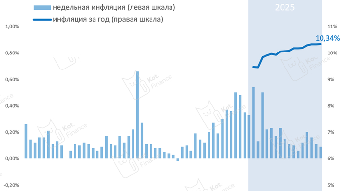— Инфляция. У инвесторов появилось новое вечернее развлечение по средам - отслеживать данные по недельной инфляции Росстата. Накопленная годовая инфляция по Росстату перевалила за 10% несмотря на ставку 📈