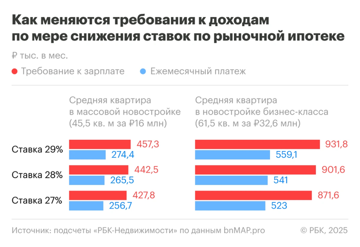 Допустим, хочется купить квартиру площадью 45,5 кв. м, которая стоит 16 млн. Такие цены есть в Москве или в Сочи. При ставке 27% годовых (рыночный уровень на новостройки в апреле) ипотеку на такую квартиру одобрят тем, чей ежемесячный доход составляет 427,8 тысяч.