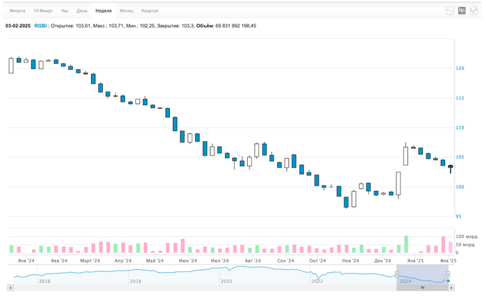 RGBI снижается шестую неделю подряд: 103,79 → 103,3. Несмотря на снижение темпов инфляции, она остаётся высокой, не верит рынок в снижение ключа. Я продолжаю немного покупать длинные ОФЗ, выше 16% YTM.