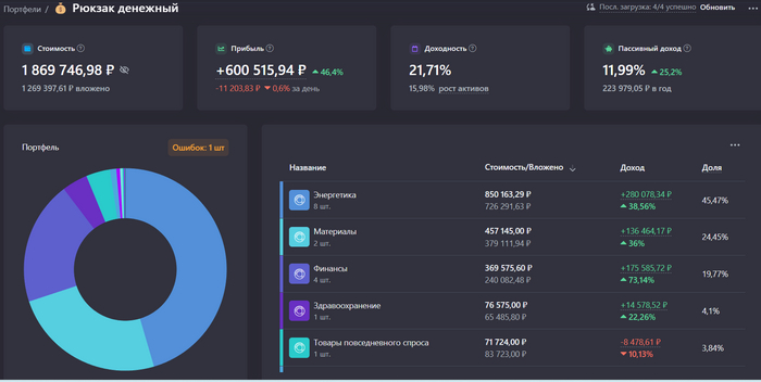 ФосАгро, НЛМК, Икс 5, Т-Банк, Интер РАО — по 3% портфеля акций (по 1,2% от биржевого портфеля).