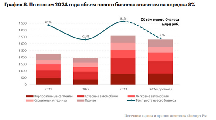 Ожидания на 2024 -8% по объему нового бизнеса. На 2025 год -20%. С учетом роста цен на актив, снижение в числе предметов лизинга будет около трети. Это одно из самых негативных ожиданий по рынку с 2014 года.