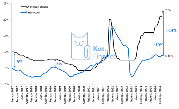 🔹 разрыв между ставкой и инфляцией достиг максимума и превысил экстремумы 2022 и 2020