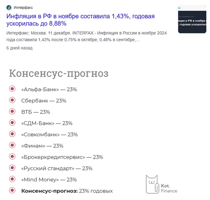 Шутка в начале поста может оказаться не шуткой, ведь посмотрите заголовок новости про инфляцию и консенсус прогноз: инфляция 8,88% убедила всех аналитиков в оправданности ключевой в 23%. Аналитиков, которые еще год назад ждали 10-13%. Можно предположить, что ожидания по инфляции были ниже, но уже сейчас разрыв между ставкой и инфляцией 14%!!! Неужели инфляцию ждали 0?