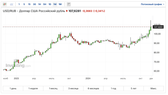 🔹Официальный курс доллара превысил 109 р впервые с марта 2022 года. Курс на ближайшие три дня 107,74 р. за 1 доллар. ЦБ отказался от покупки валюты до конца года.