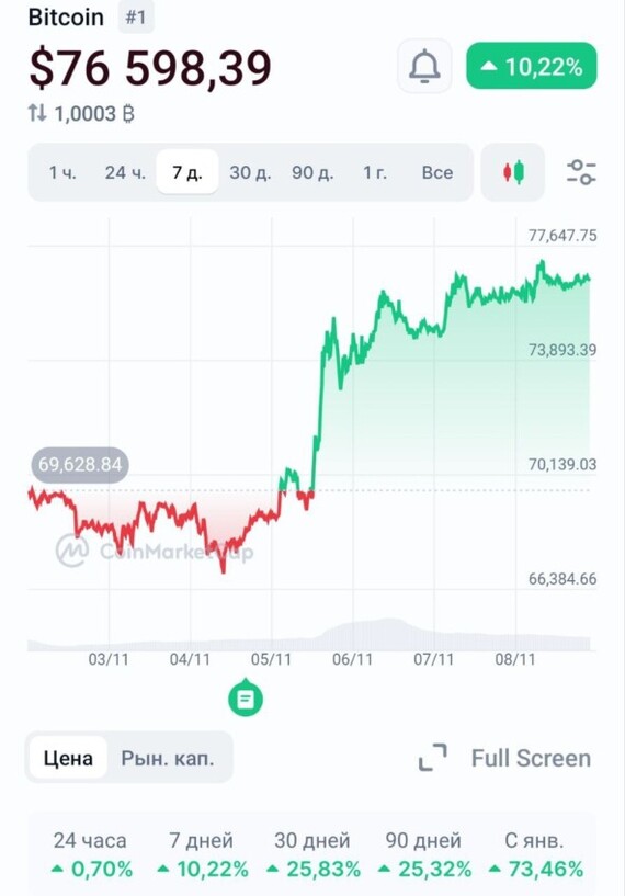 Биткоин обновил рекорд, пройдя отметку в 76к. Мой криптопортфель чуть вырос с 1570 до 1860 долларов. Ну как покупать по таким ценам-то? Эх…