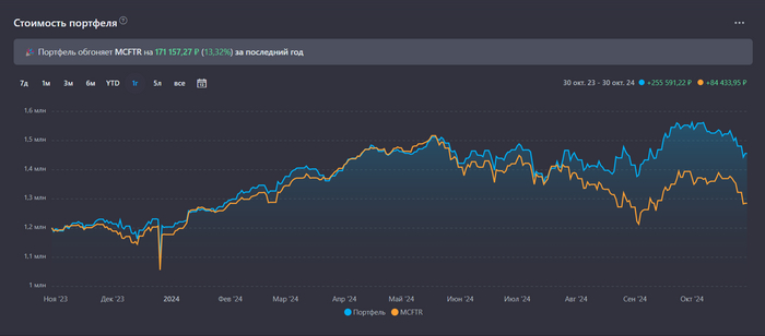 Веду бой с тенью, а точнее с индексом Мосбиржи полной доходности. Я пока впереди на 171 000 рублей, портфель обгоняет бенчмарк на 13,3%.