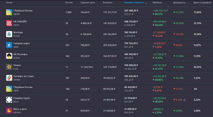 • 12 компаний из моего портфеля (Сбербанк, Лукойл, Роснефть, Татнефть, Газпром нефть, ФосАгро, Полюс, НоваБев Групп, МД Медикал Групп, Совкомбанк, Новатэк, Алроса) занимают 90% портфеля.