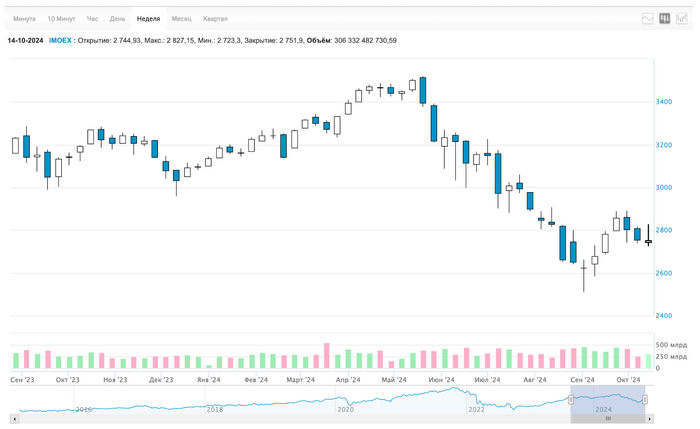 Индекс Мосбиржи колбасило всю неделю, но в итоге он расстроился и показал снижение третью неделю подряд. Итоговое изменение IMOEX за неделю с 2 754 до 2 751. Тут ещё и дивгэпы были, так что нормально. Заседание по ключу все ждут, там будет что-то более-менее (скорее менее) понятно.