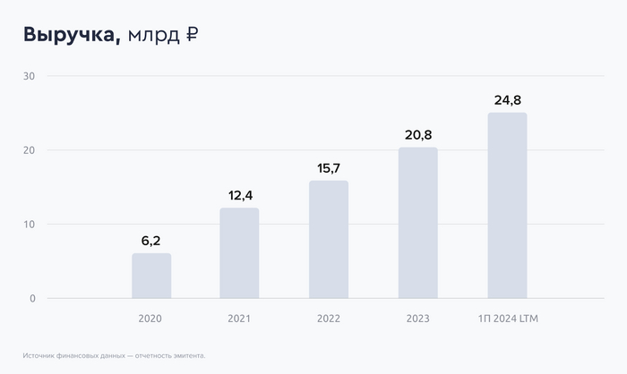 Компания активно развивается, практически все доходы от деятельности инвестируя в расширение бизнеса. Посмотрим МСФО за 1П2024. Выручка составила 12,7 млрд (+46% г/г). EBITDA выросла до 2,9 млрд (+10% г/г). Чистая прибыль составила скромные 0,5 млрд (-32% г/г). Чистый долг вырос до 24,9 млрд (+55% г/г), при этом показатель Чистый долг/EBITDA также увеличился — до 3,7 (3,2х годом ранее).