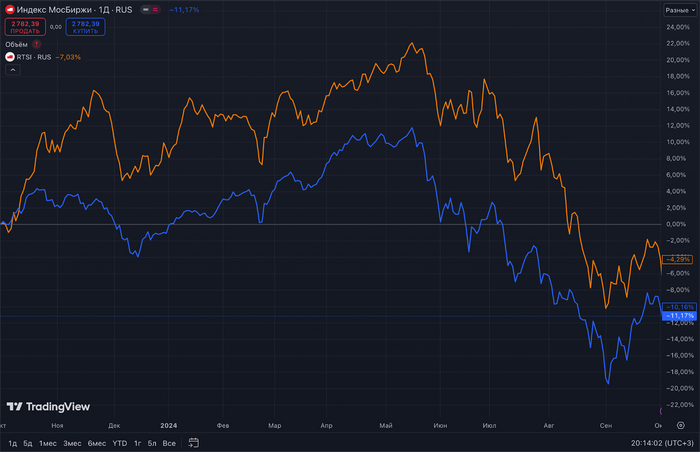 Индекс Мосбиржи вырос в сентябре с 2605,15 до 2804,62 пунктов (+8,59%). Основными причинами снижения является повышение ставки до 20%, высокая инфляция, выход дружественных нерезидентов.