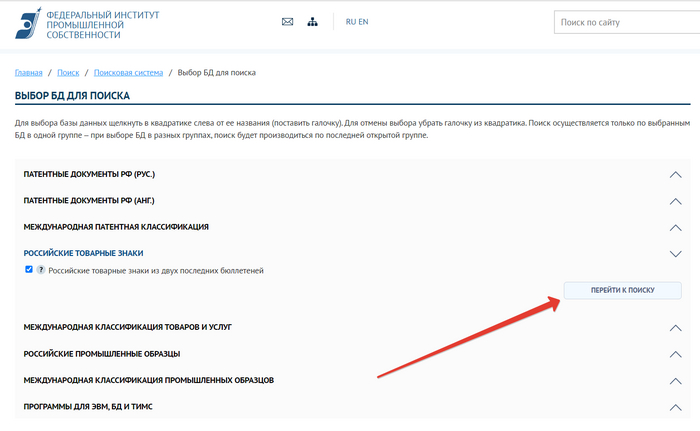 2. Российские товарные знаки можно посмотреть на сайте Роспатента, международные действующие в РФ — в международной базе.
