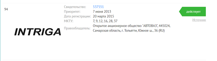 От запуска «LADA Intriga» видимо отказались: знак зарегистрировали еще в 2015, но одноименная машина так и не вышла. Вот уж и правда интрига:
