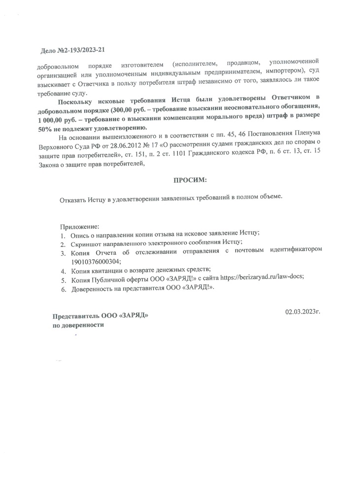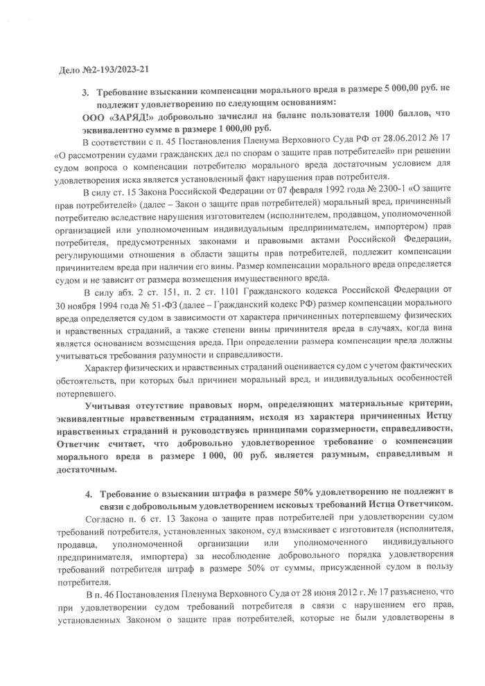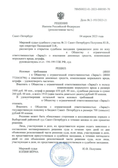 Компенсация морального вреда в размере 1000 рублей - это унизительно малая компенсация для потребителя, а у компании "Бери заряд!" нет мотивации каким-то образом добровольно решать проблемы в досудебном порядке.