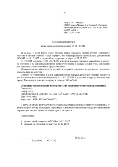 На консультации я посоветовал Анастасии отправить в «Бери заряд!» претензию, а также помог ее составить. Было ощущение, что это все явное недоразумение и после получения претензии компания во всем разберется.
