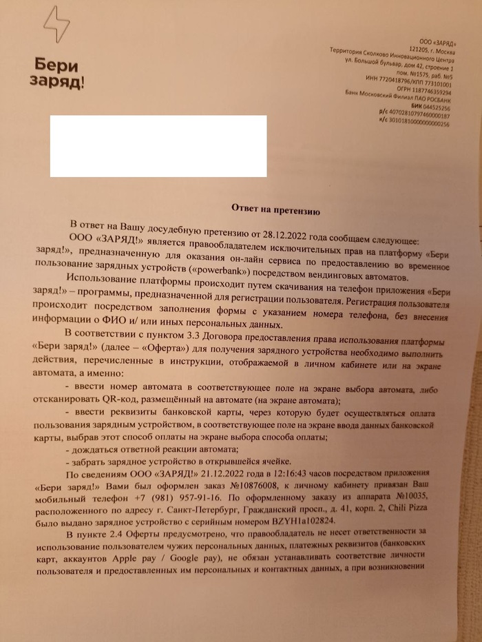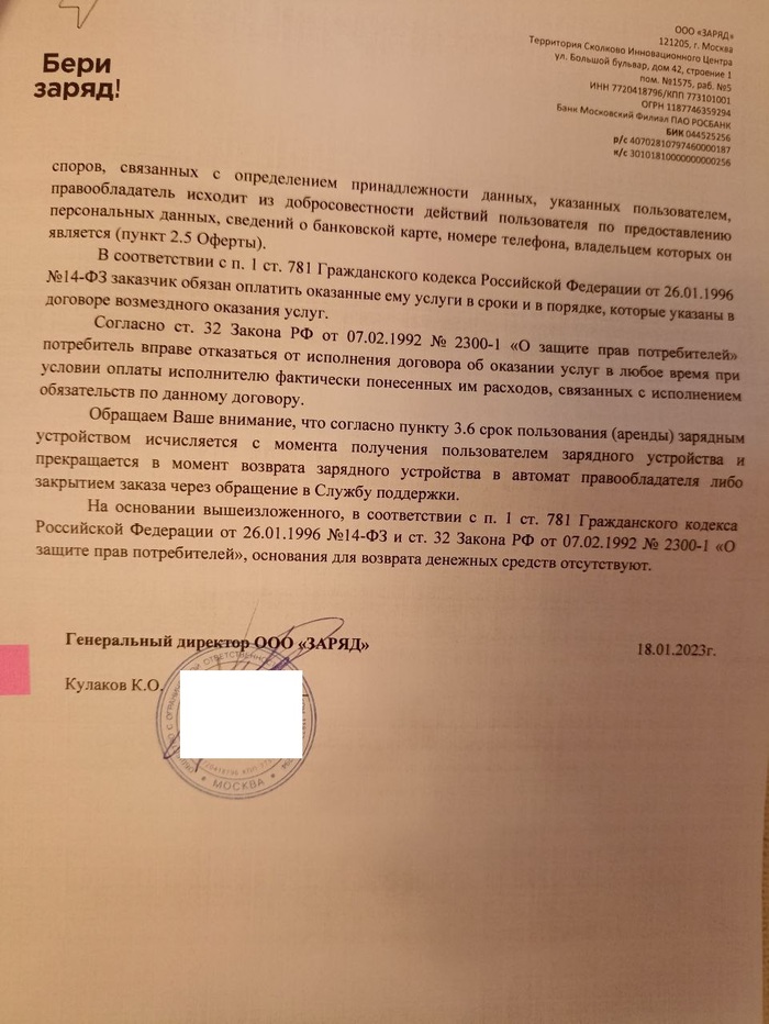 Примечательно, что ответ подписал сам основатель компании и генеральный директор «Бери заряд!» Кирилл Кулаков.