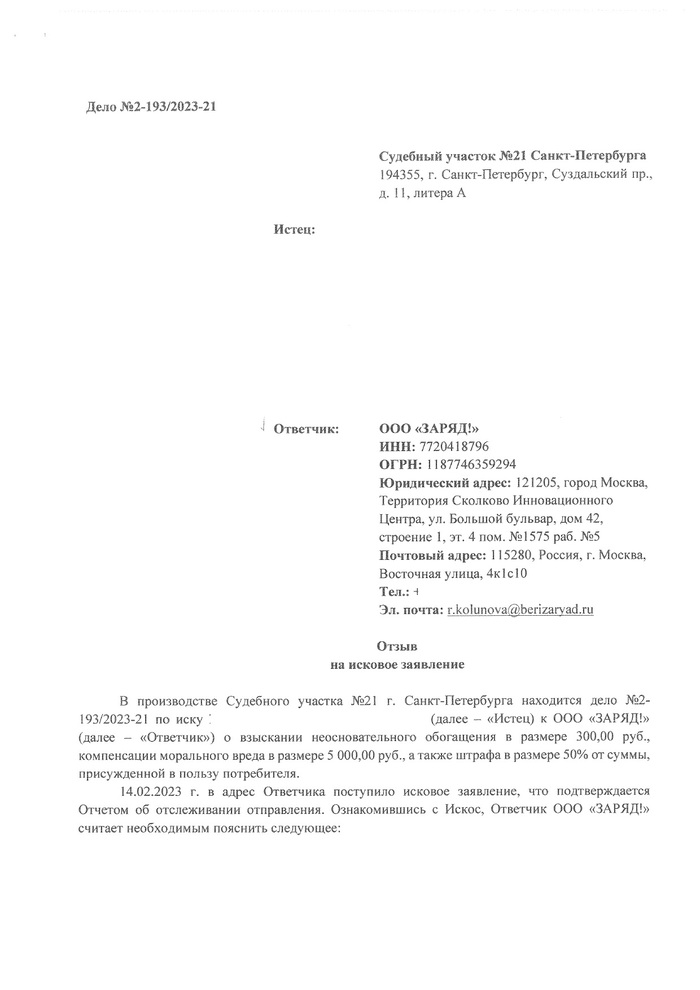 Спор с "Бери заряд!" представляет собой дело о взыскании неосновательного обогащения, по своей логике это дело, аналогично суду с Тинькофф банком, когда Банк не имея правовых оснований списал со счета клиента 1 300 т.р.