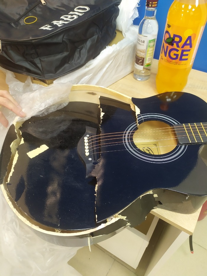 Ну и вторая гитара, тут еще веселее. Фотки от клиента, на которых видно что он прикупил всякого чтобы обмыть покупку, но не тут то было. Явный след от ноги на упаковке и гитара, как сказал покупатель "в хлам". Аналогично, есть видео упаковки товара без повреждений.