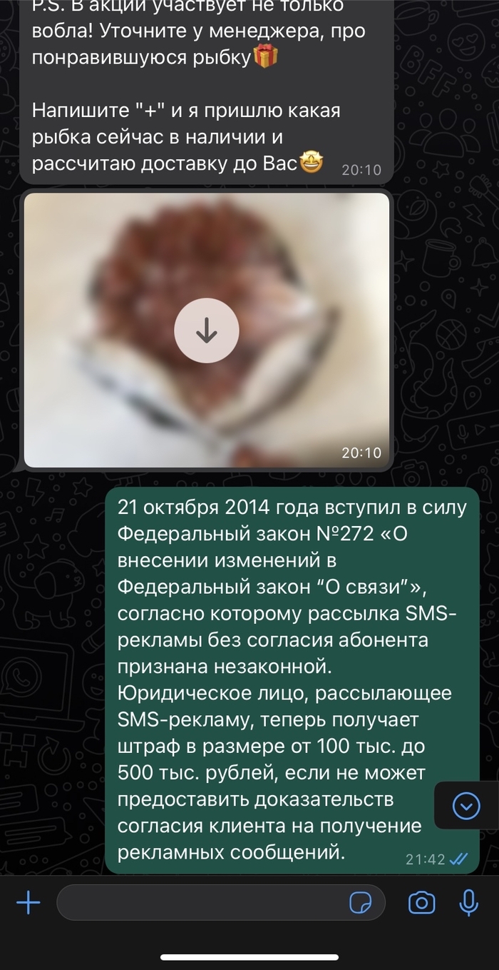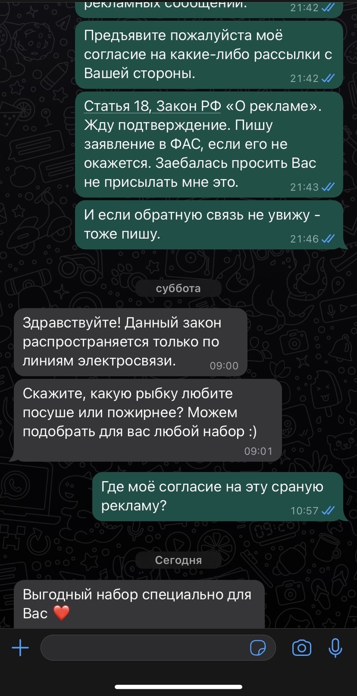 Не буду тянуть кота за яйца, дело такое: есть одна компания, которая меня уже искренне заебала своей рекламой. Продают какую-то рыбу и по несколько раз в неделю присылают рассылки на ВатсАп. Даже звонили несколько раз. По-моему я никогда к ним не обращалась, и тем более (100%!) не давала никакого разрешения на рассылки и т.п.