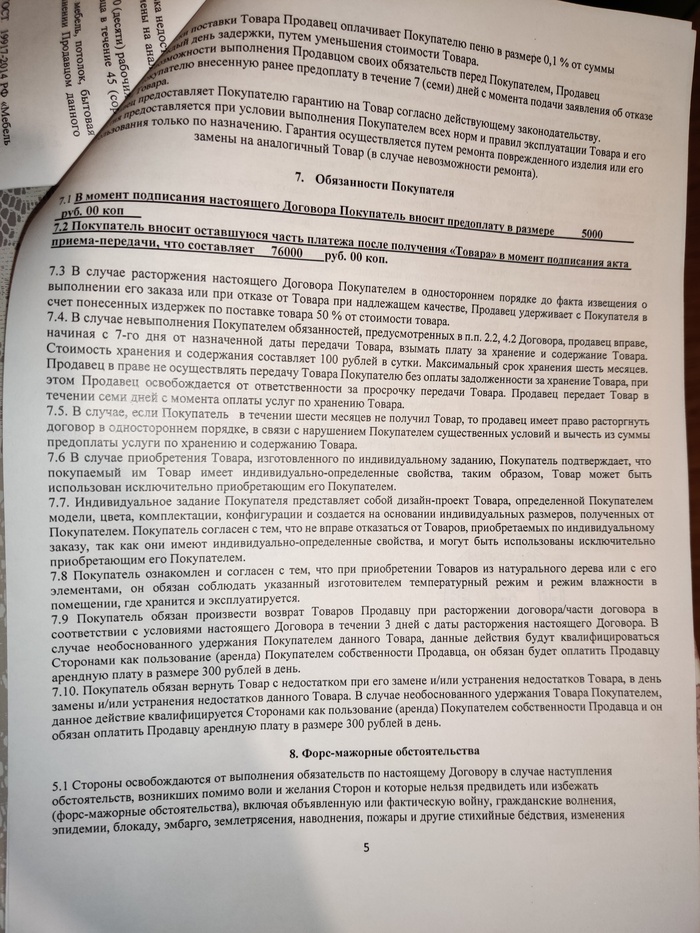 4. На какой ляд тут вообще предоплата? Если договор итак ставит раком покупателя? Ты либо отдаешь половину цены и остаешься без дивана, либо всю цену, но с диваном.