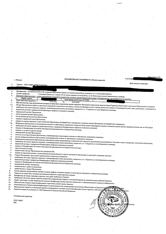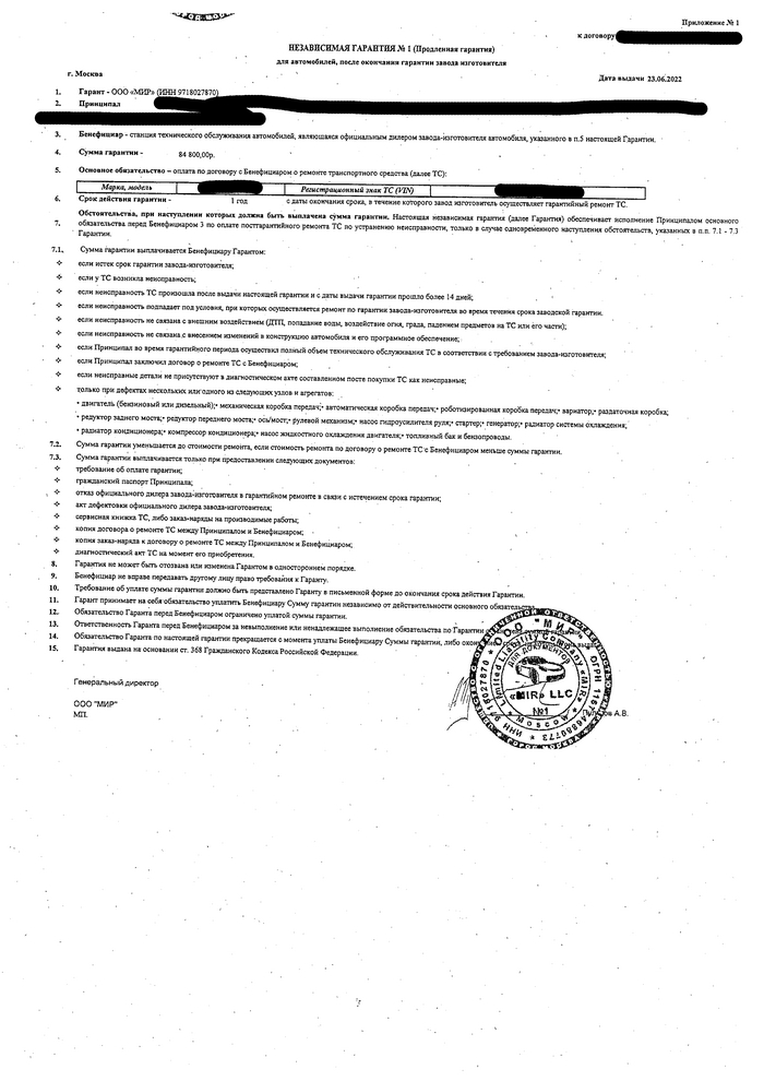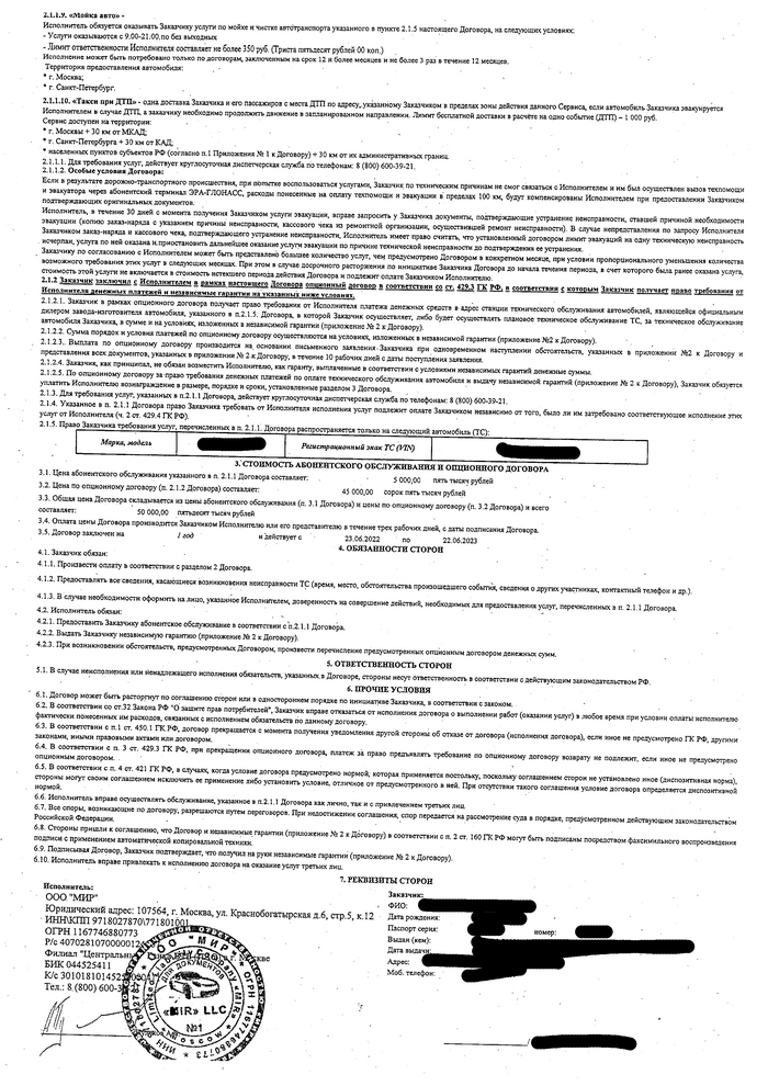 При покупке машины 23.06.2022 у дилеров в СПб, по глупости и по напору (дилер отказывался продавать ТС без данной услуги) был заключен договор на "Тех Помощь на дорогое (ООО "МИР")", думал хорошая вещь...но недавно почитав отзывы, понял что это просто развод на деньги, помощь если будет оказана, но в лучшем случае не скоро.