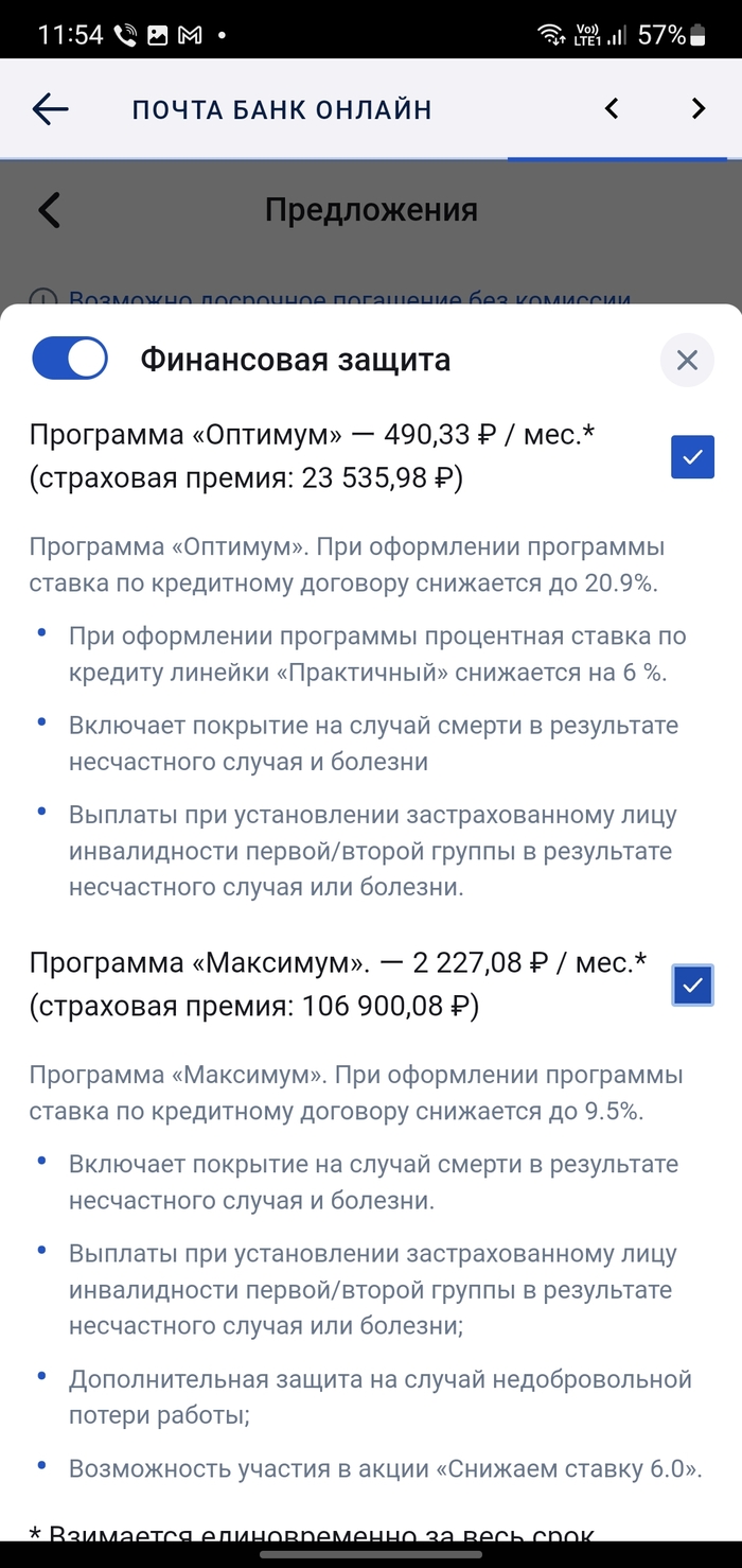 Ну чтож, начитался я способов побеждания банков в вопросе применения страховок и решил что зло наконец-то уязвимо, а тут как раз предложение от Почта Банка на мыло упало, предлагают взять 394тыс под 7,5%. Очень заманчивый процент, естественно без страховки будет выше на смешные 15,4 пункта. Но мы то живем на пикабу и готовы эту схему повернуть к себе передом, а банку задом! Перехожу по ссылке в приложение банка, выбираю срок 4 года и нажимаю рассчитать под 22,9%. Самый простой показатель выгодности кредита - это сравнивать размер ежемесячного платежа, без страховок он 12607 рублей.